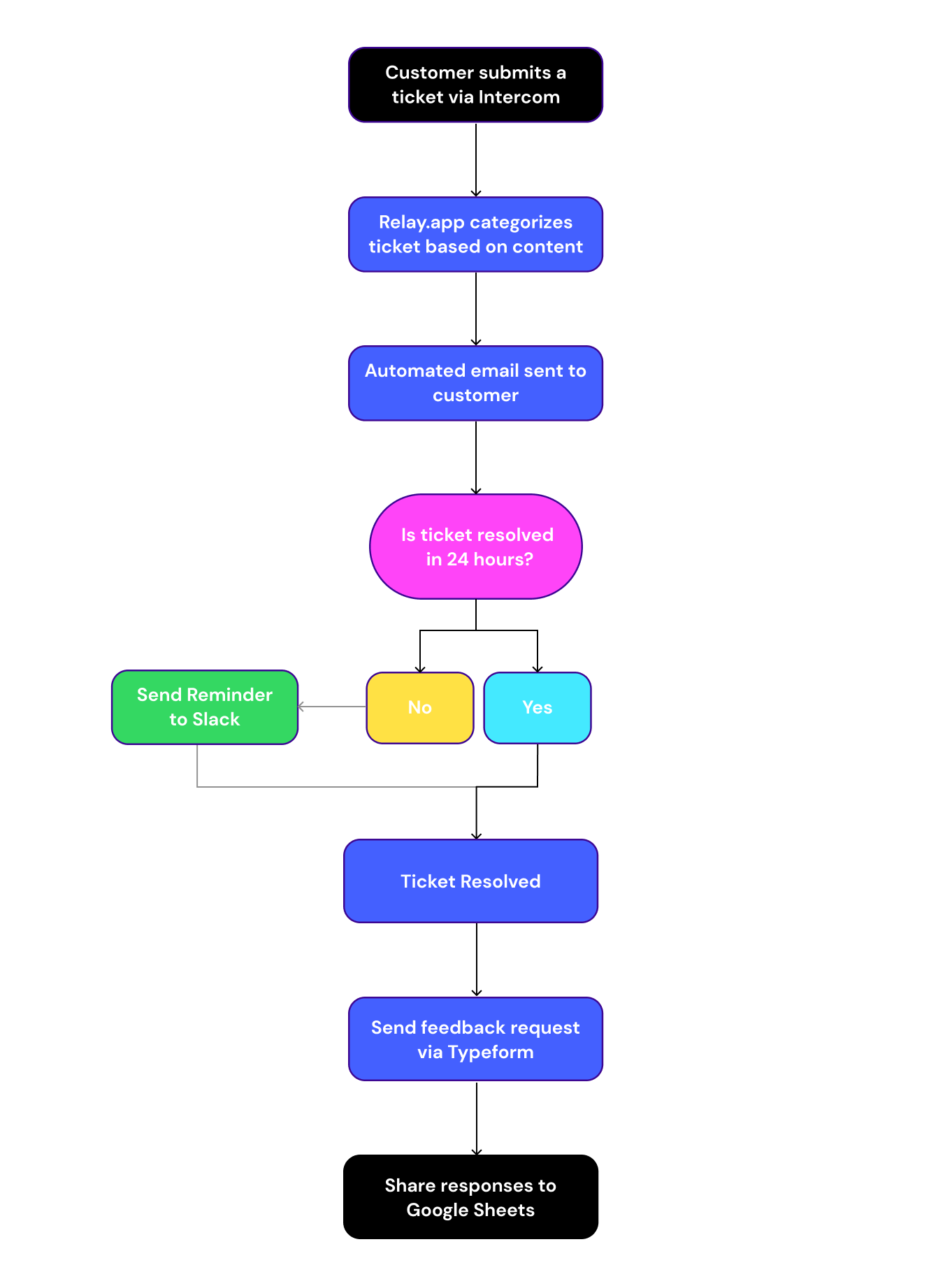 - Relay.app triggers an automated response to the customer, acknowledging receipt of the ticket and providing an estimated time for resolution.