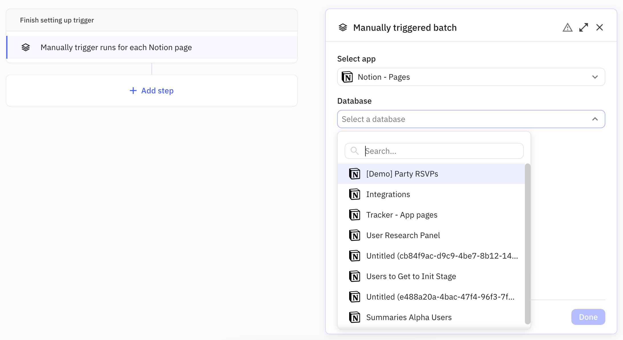 To configure the trigger, select Notion as your app and choose the right database.