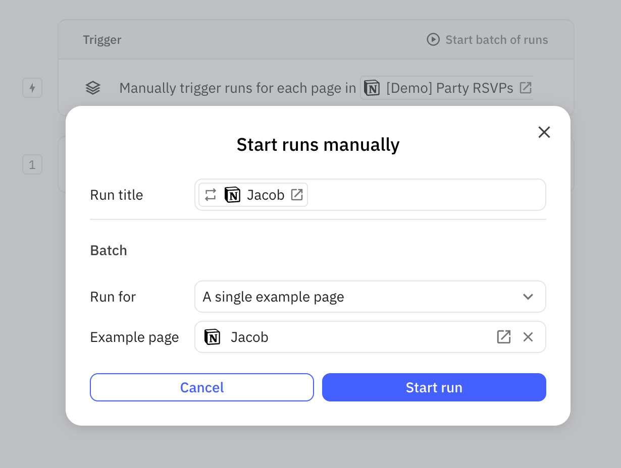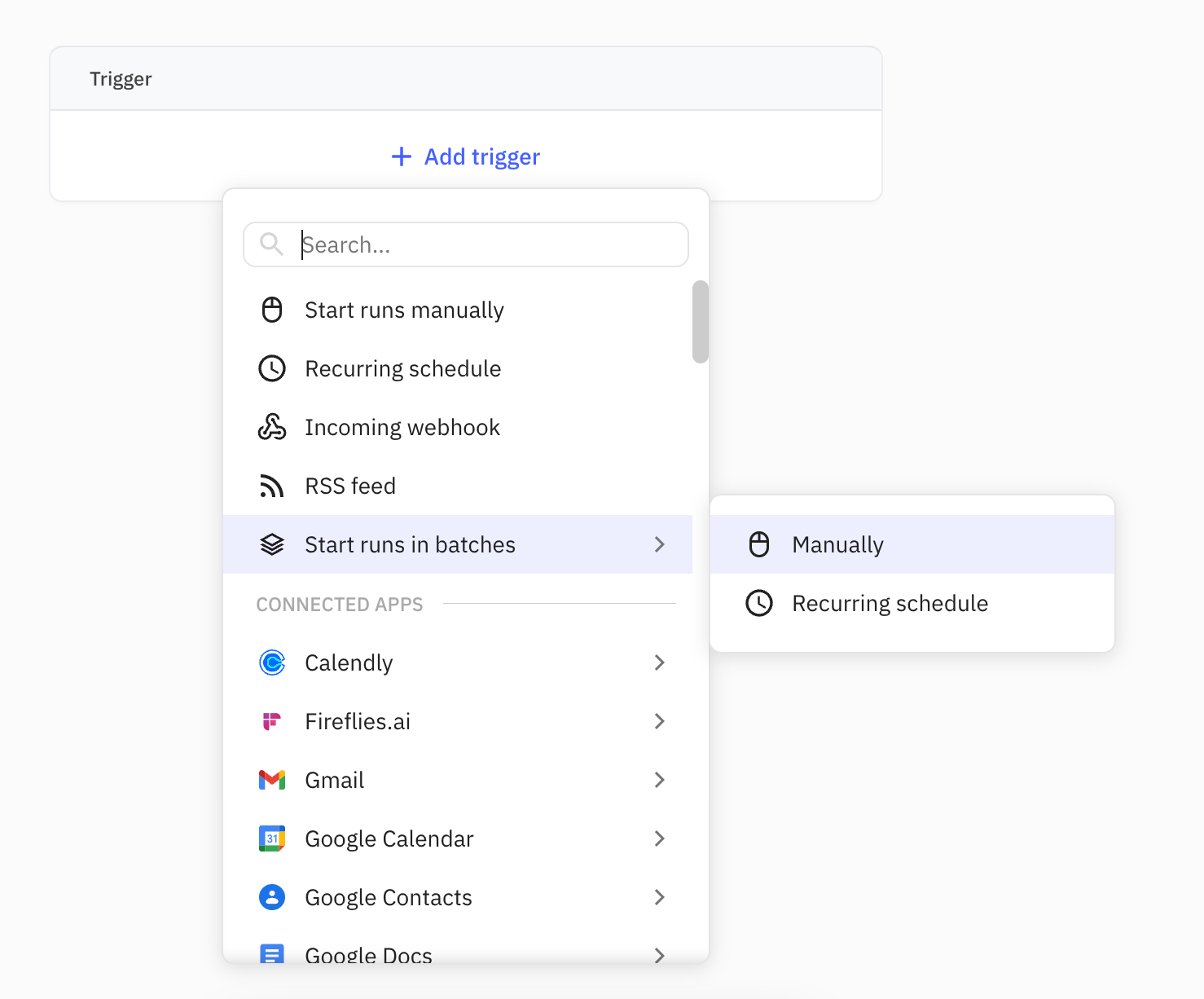 In Relay.app, you’ll set up a Batch Trigger by going into the Trigger menu and selecting “Start runs in batches”. You can either do this on-demand by clicking “Manually” or you can set up a “Recurring schedule” (for example, if you want to email a list of people every week). For this example, we’ll do it on-demand.