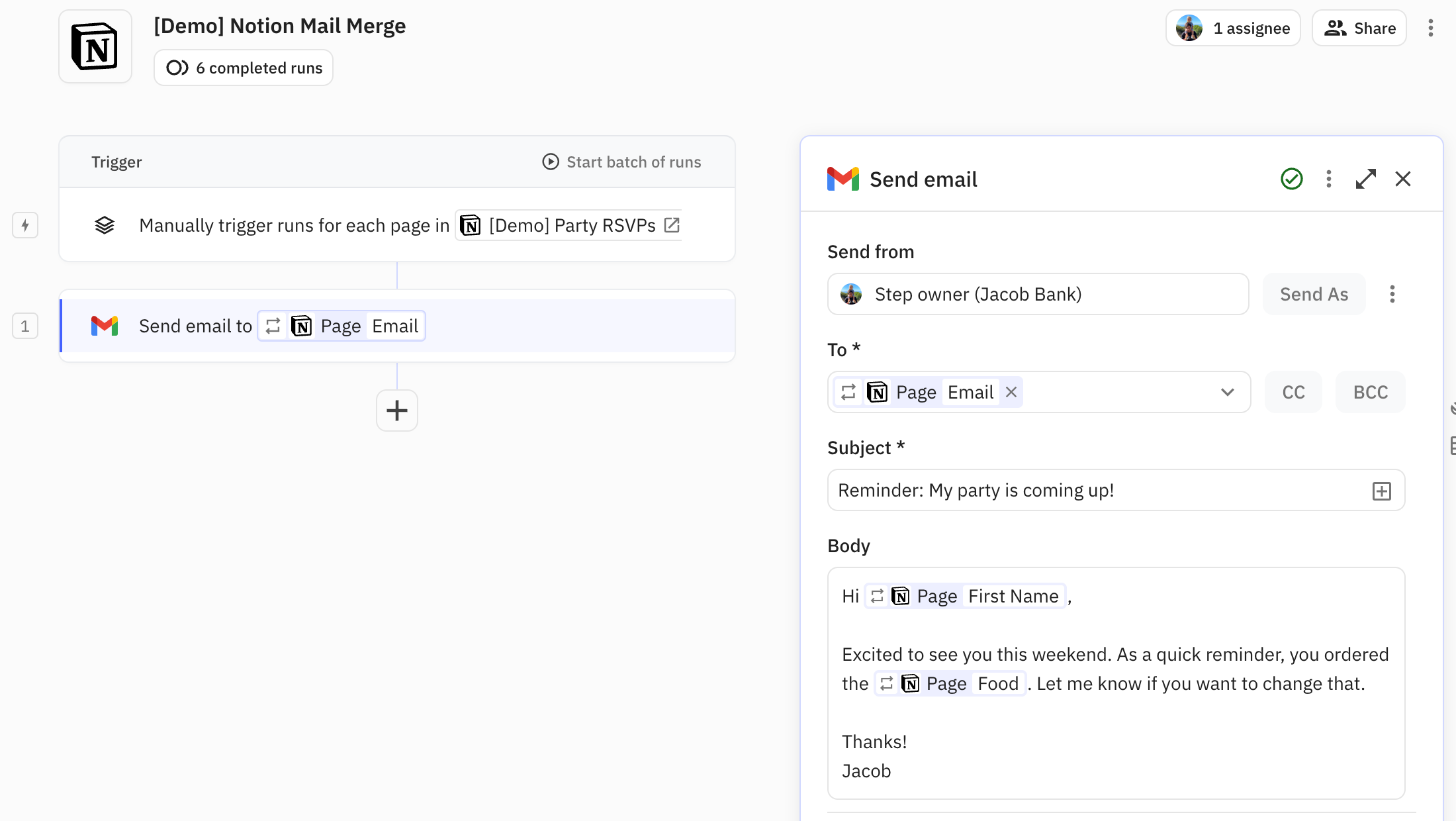 Next, you’ll add the automation to send the email, using Gmail in this example. In the “To” field, you can select the email address of the current Notion page. In the body of the email, you can reference the first name and any other information that’s relevant.