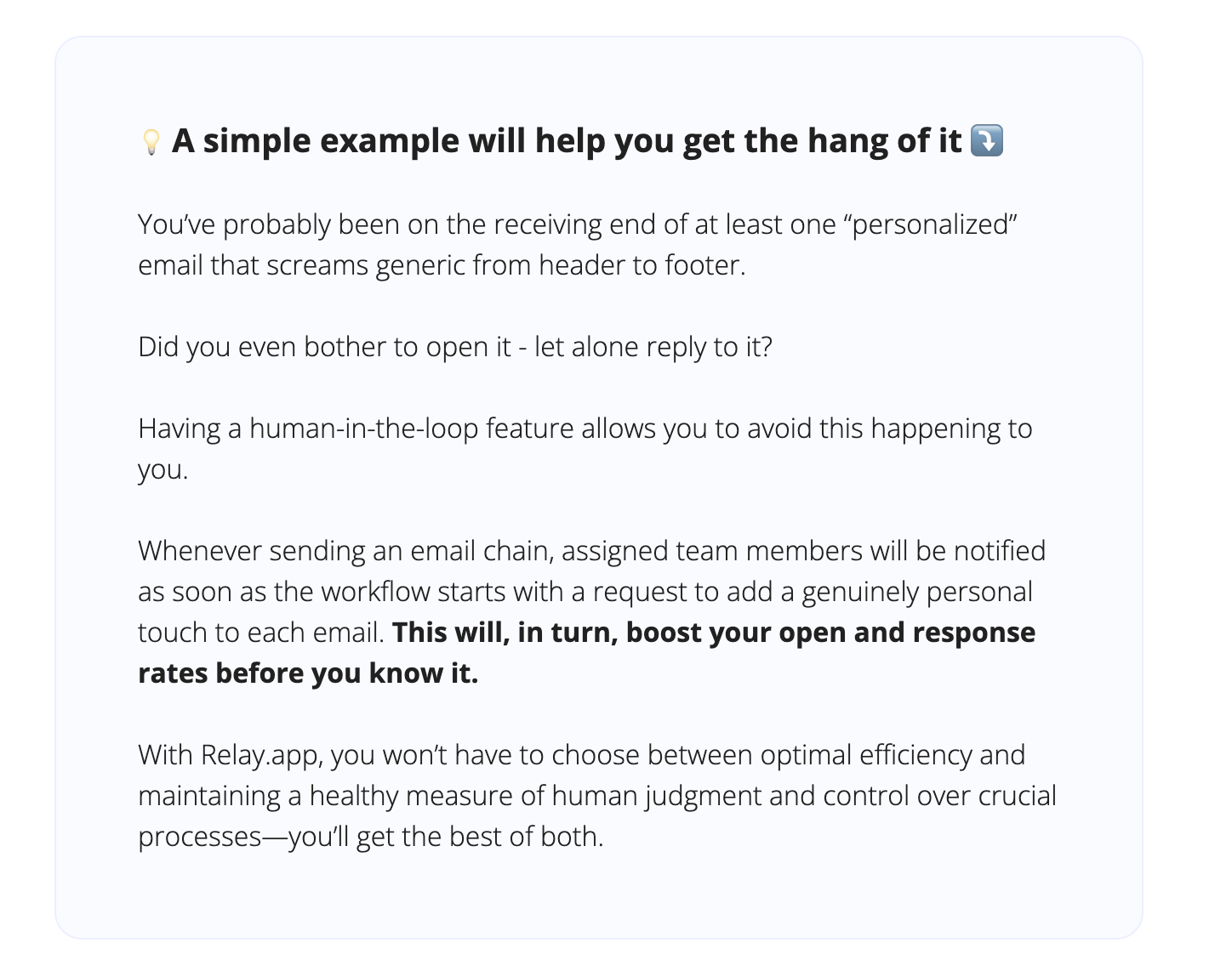 “As a consultant, I use several different tools that need to talk to one another (e.g., Notion, Gmail, ConvertKit, etc.). Relay.app brings them all together for a really affordable price. While automation is great, there are also times I want to review something before it's passed on to a customer. Relay.app uses AI to do most of the work for me while alerting me to review, say, a generated email before it goes out. This shaves off 90% of the time and effort it would have taken me while still giving me ultimate control of the work.”