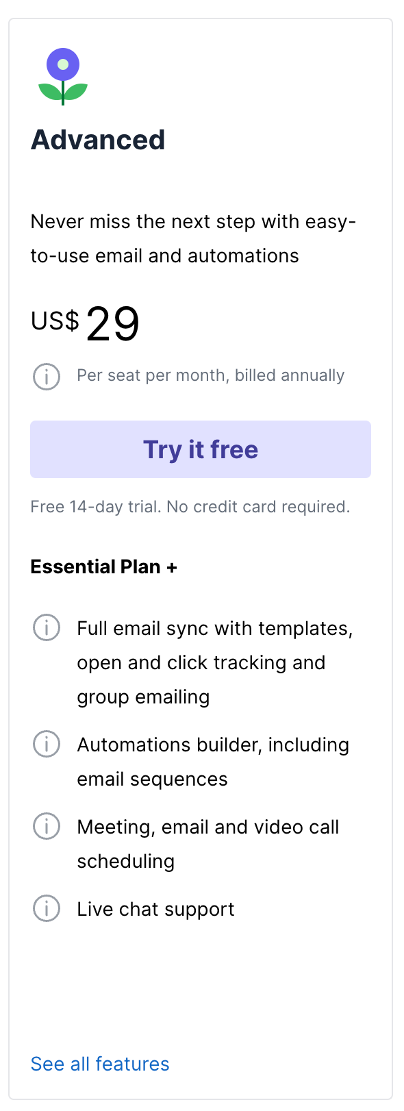 The Advanced plan is second in line. It costs $29 per user per month ($24 if you opt for annual billing).