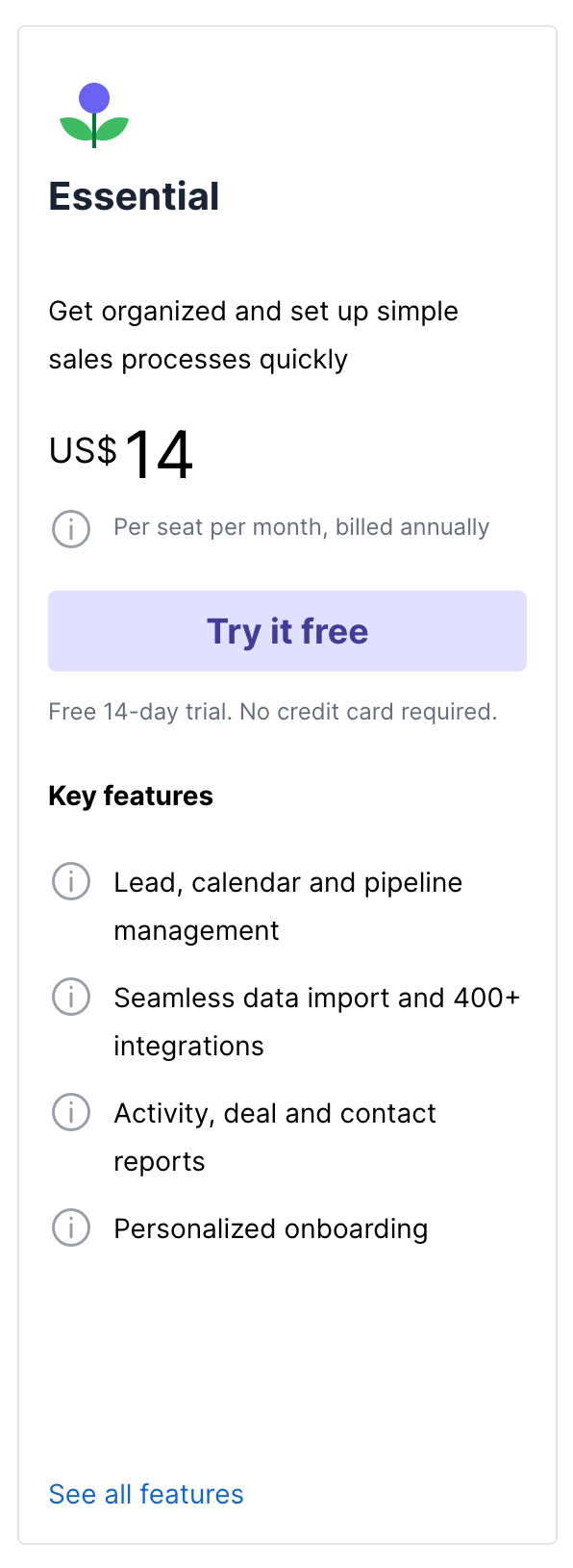 💡Note: Each plan comes with a 14-day free trial period, which allows you to get a taste of Pipedrive key features.