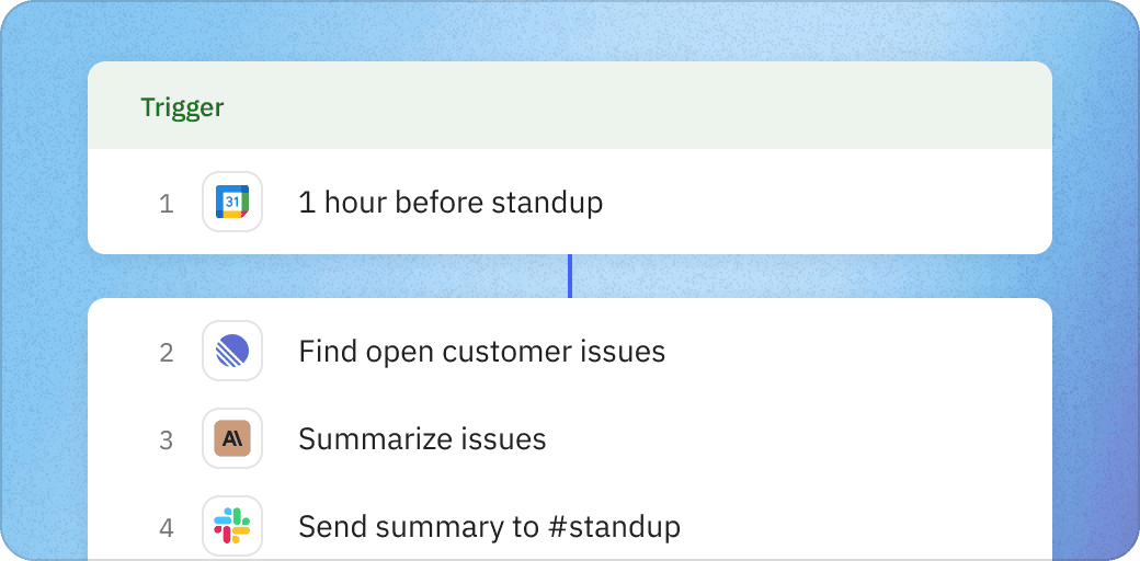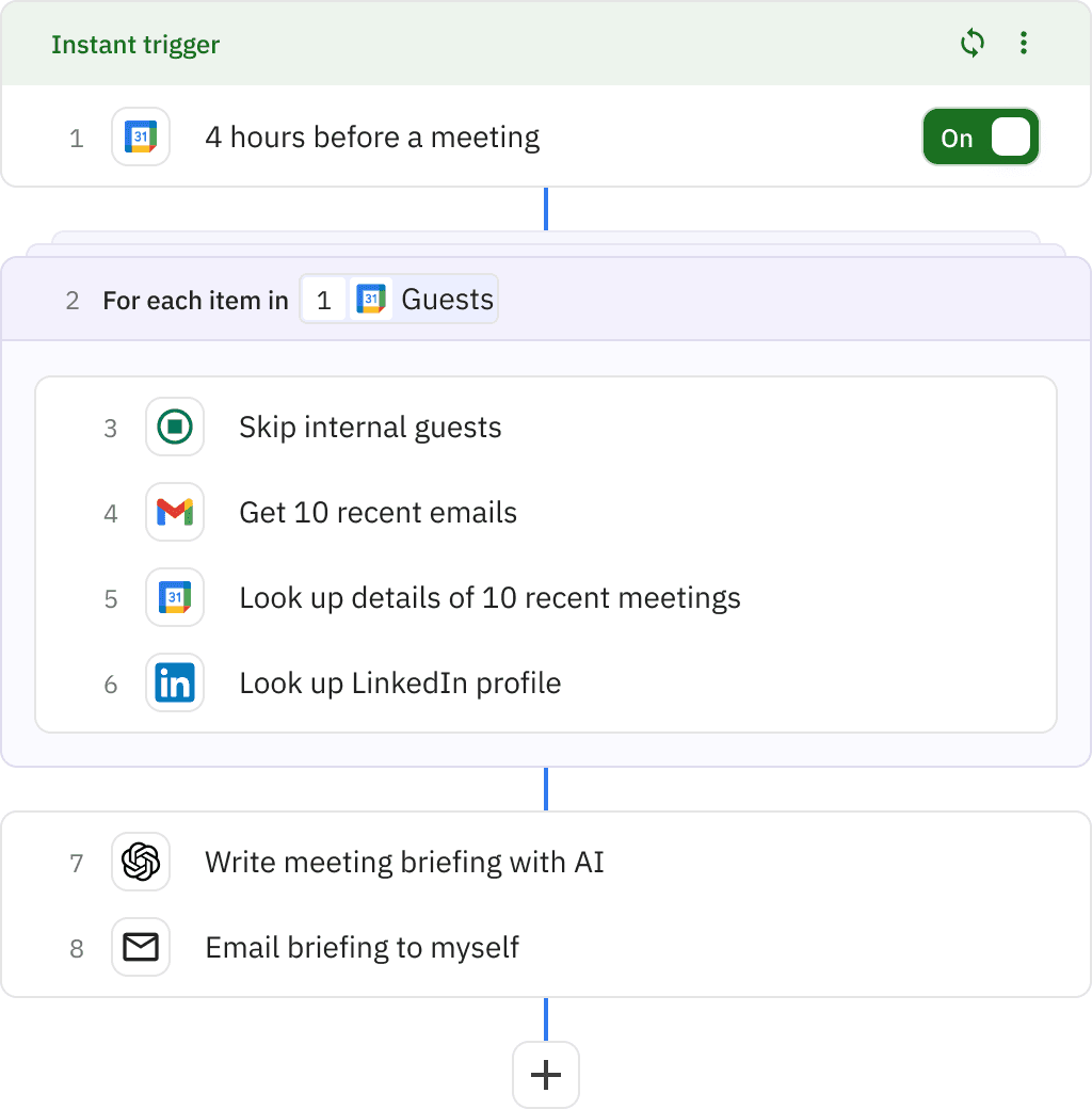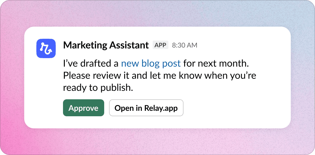 Type what you need your agent to do, and when it should do it. Relay.app will build it for you.