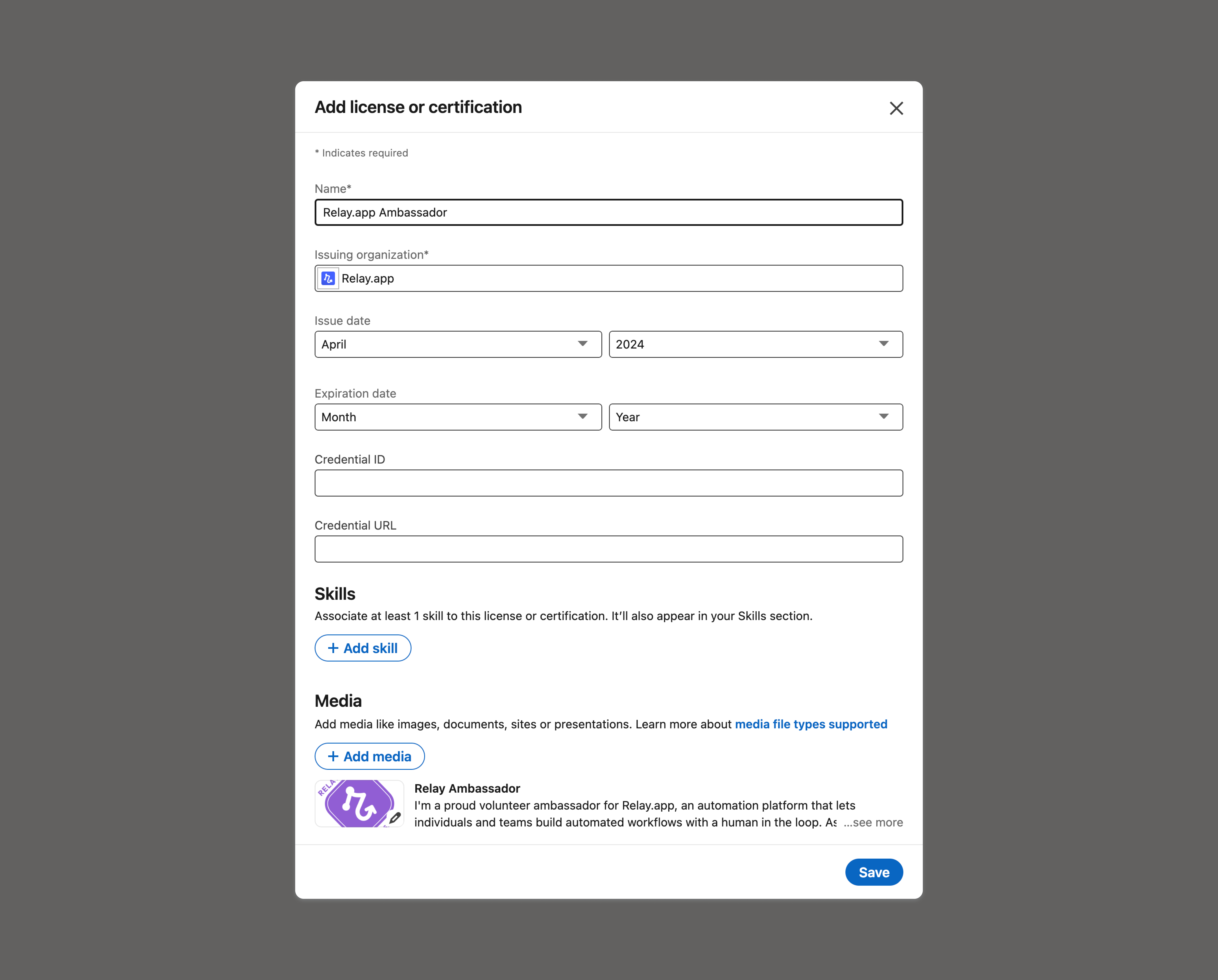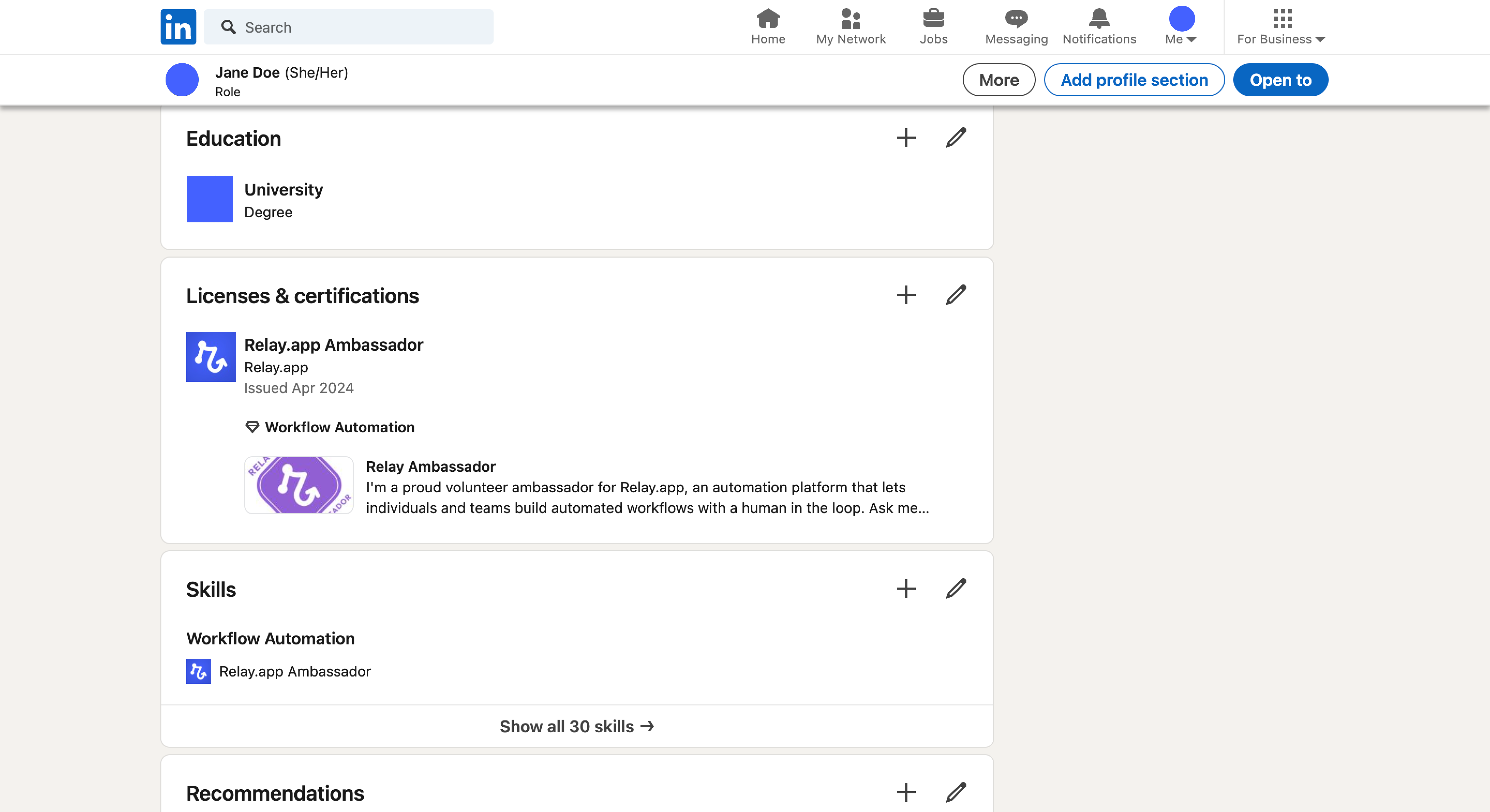 Adding a LinkedIn certification is a nice way to show the community you're a certified ambassador. Until we set up an official certification program to provide you with an ID and certificate, we suggest you add an unofficial Relay.app Ambassador Certification to your profile.