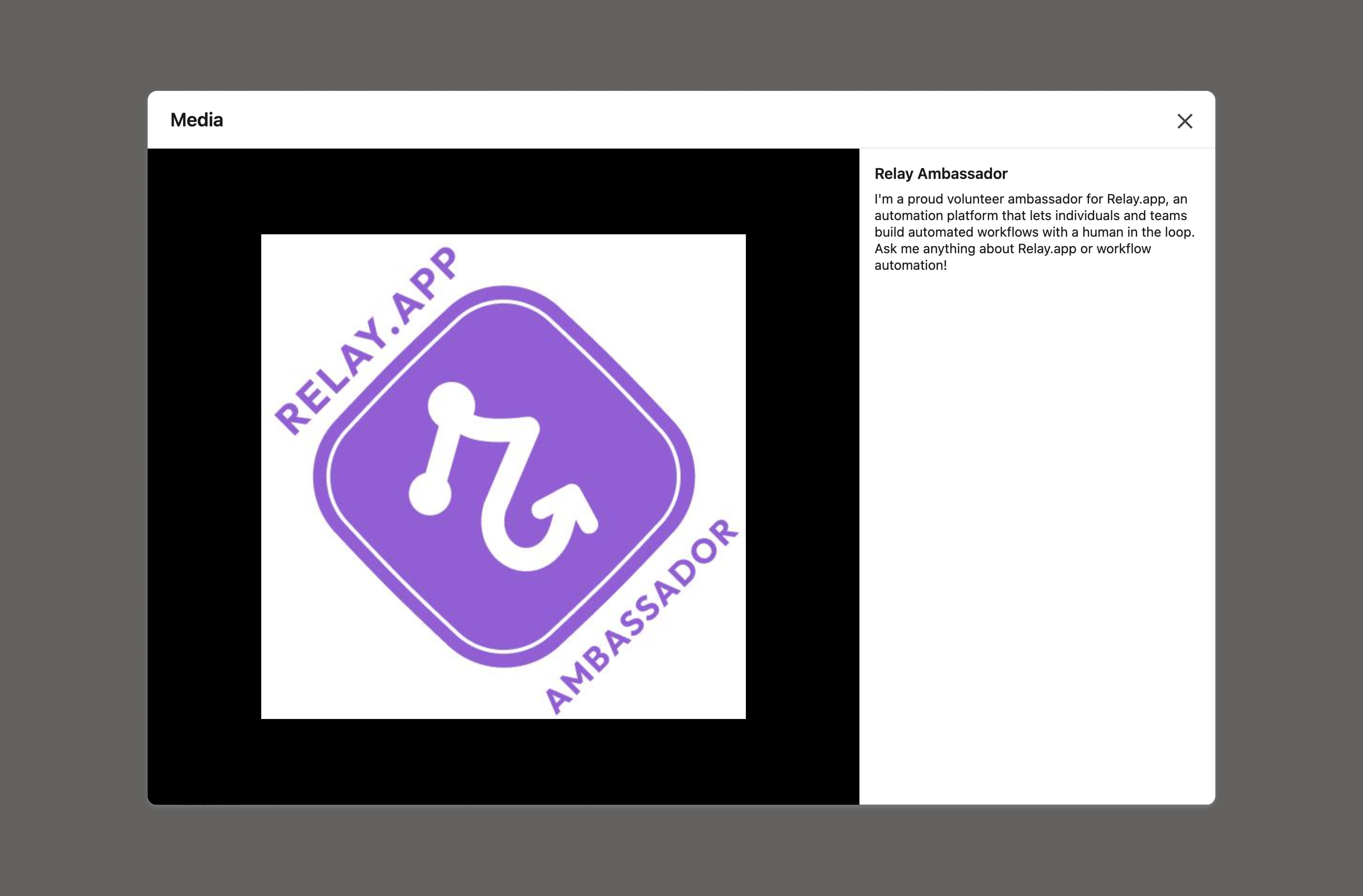 Thank you for being part of the Relay.app community! This page has the link to download your ambassador badge, a guide for adding it to your LinkedIn Profile, and other tips.