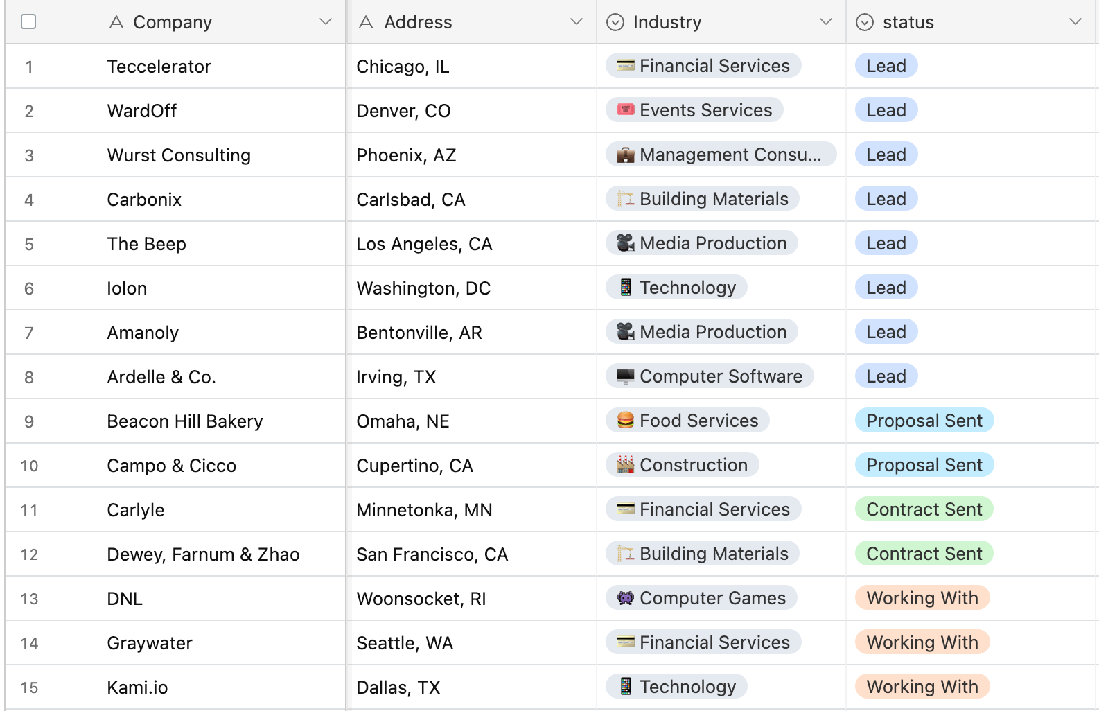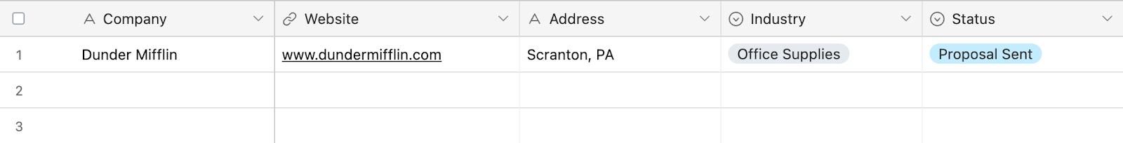 For example, the template we used lists the number of employees at each company. For this scenario, we’re going to build a simple personal CRM, so that information isn’t relevant. We traded it out for a “status” field that shows where the company is along the pipeline.