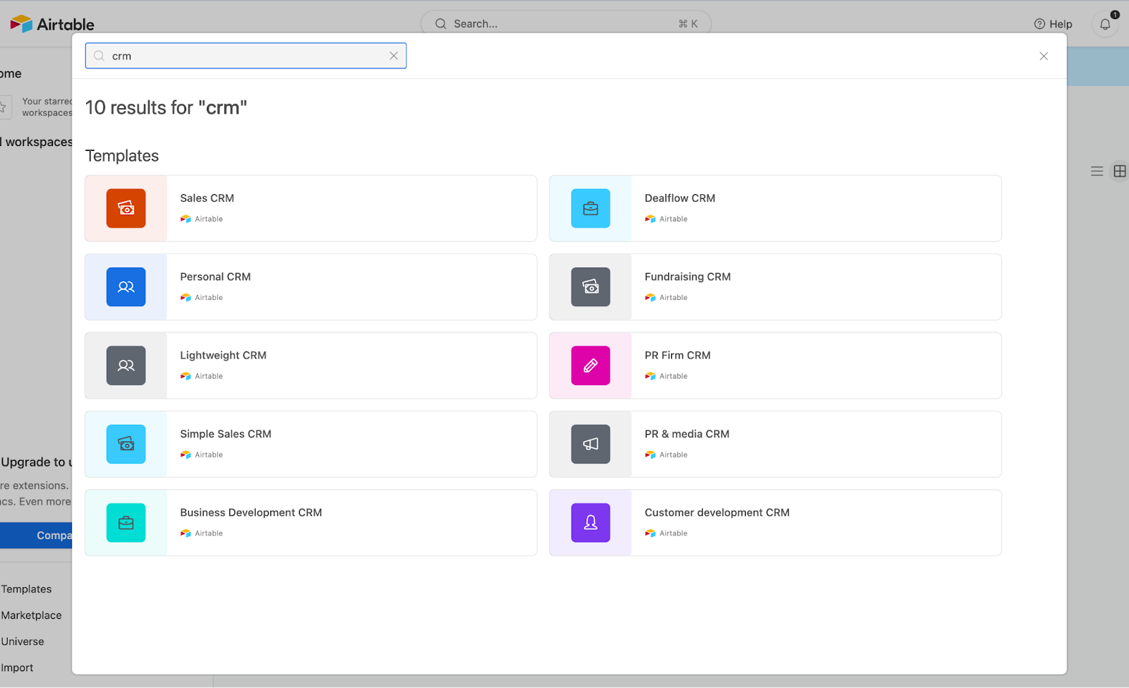 Once you’ve created a free Airtable account, you’ll find Templates at the bottom of the sidebar. Click Templates and search “CRM” to see the collection of CRM templates. Click Try this Template to add it to your workspace.