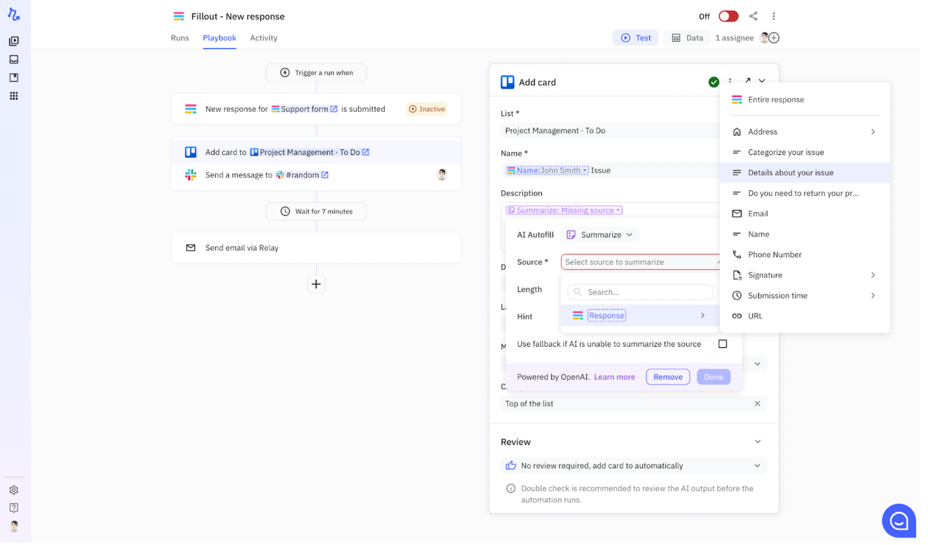 With Fillout’s AI-powered form creation, and Relay’s AI-enhanced automated workflows, you can build the perfect balance between automatically getting work done and having your team jump in where human judgement is needed.