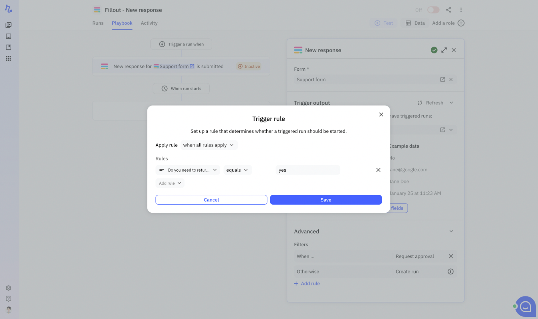 Say you have a support form where customers can ask for help—or notify your team of a defective product and process a return. The latter likely needs human intervention. Click Advanced, then add a filter that watches for when your form’s return button says yes, and select Request approval.
