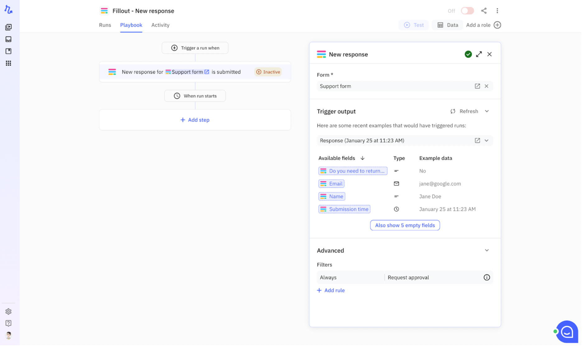 Build a new Relay Playbook starting with Fillout’s New response trigger, and choose the form you want to automate. Relay will run your automations every time this form gets a new entry.