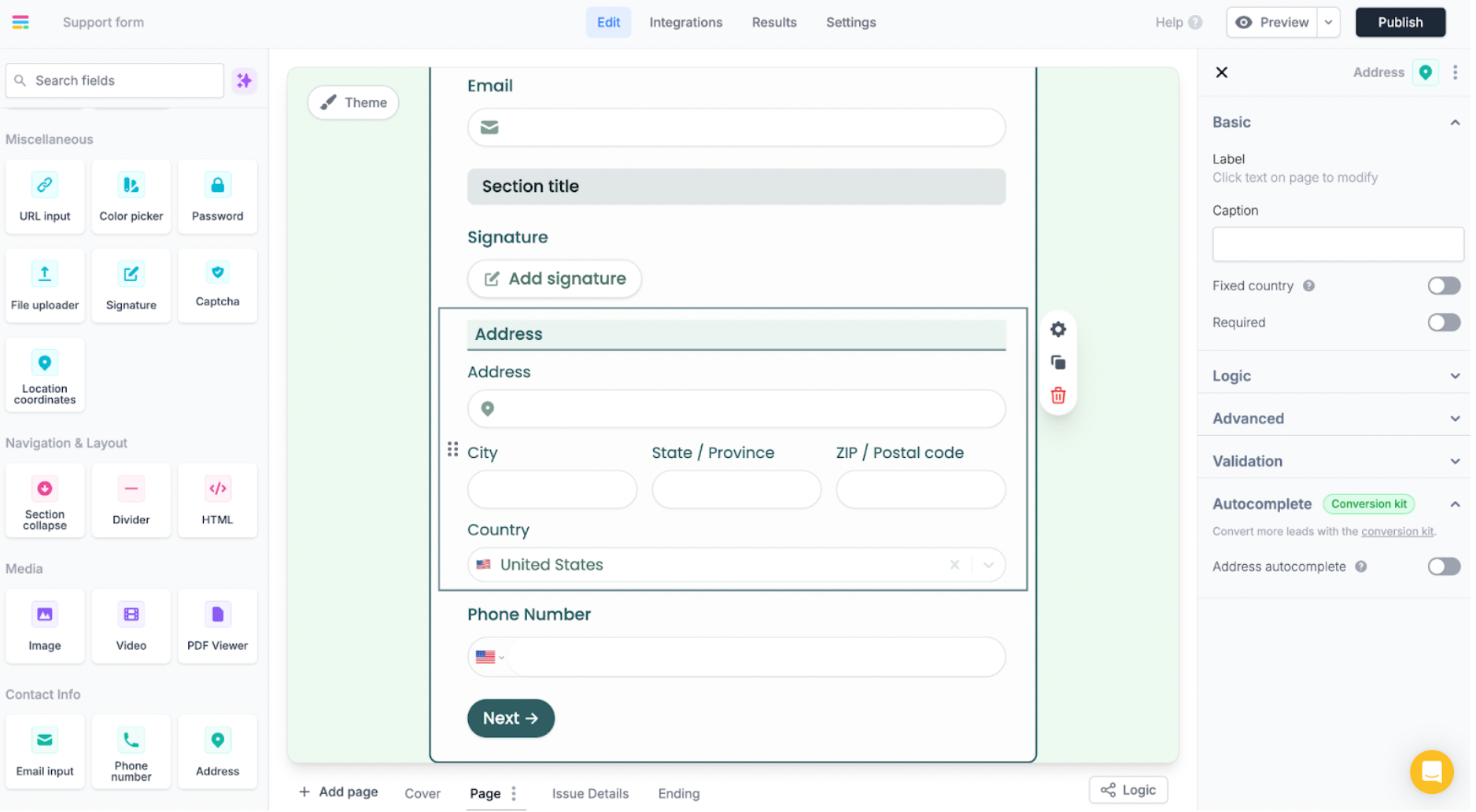 Everything’s built to make it as easy to gather data as possible. Default fields include helpful extras, like the country code selector on the phone number field, along with country and state fields for addresses.