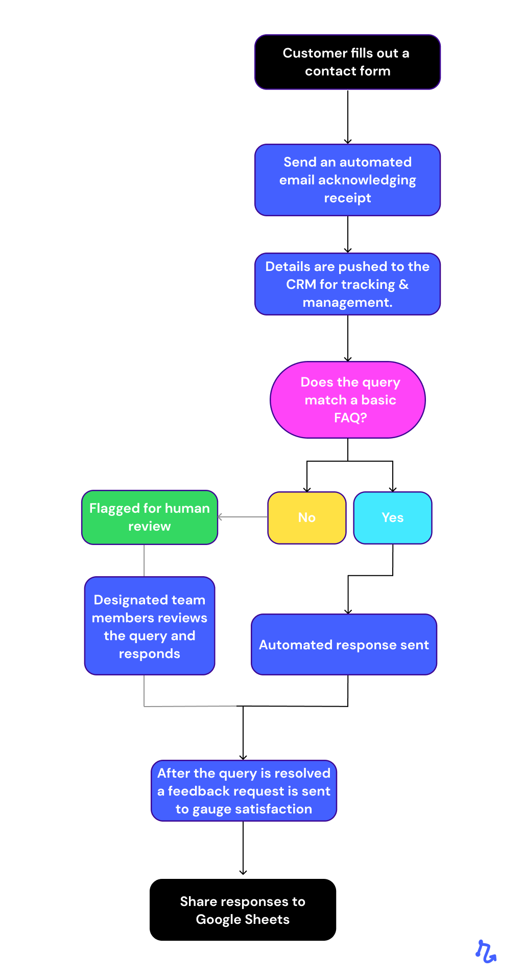 This automation flow ensures that routine tasks are handled swiftly, hence improving response times and overall customer experience while safeguarding the human touch for nuanced customer services.