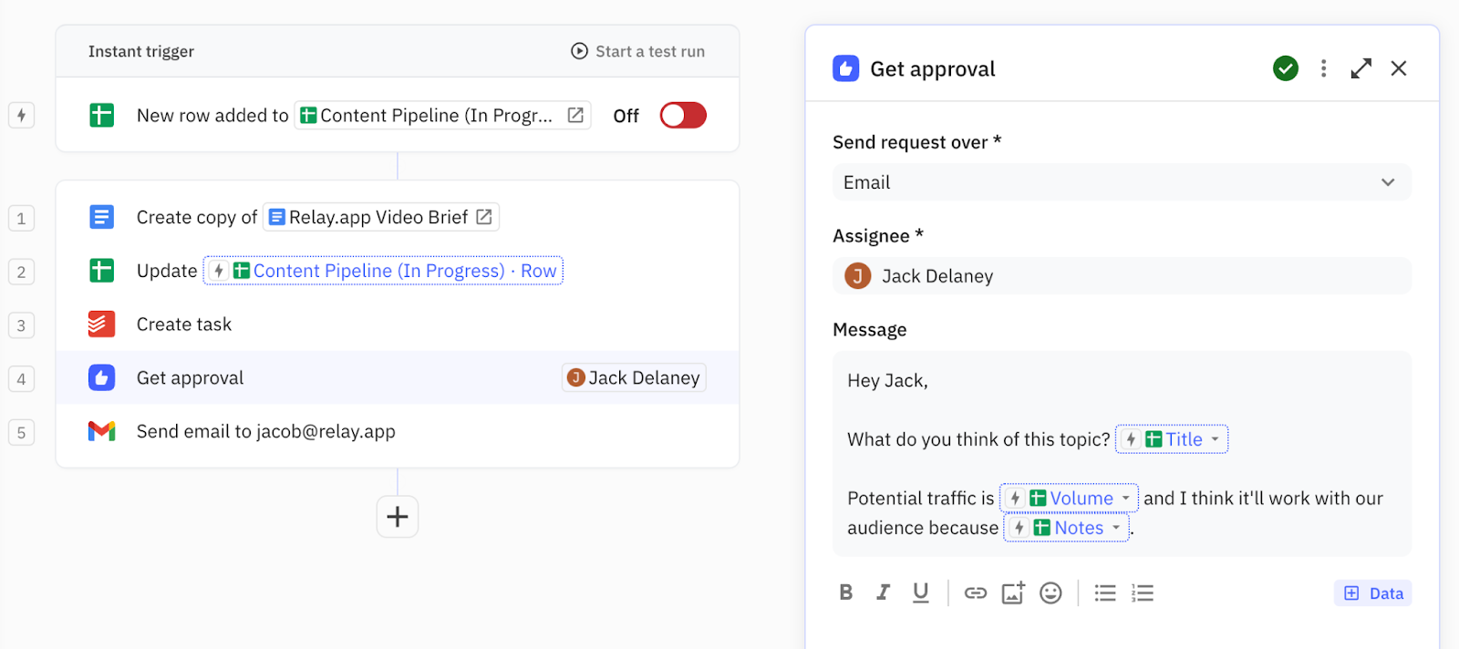 ✍️ Streamlined content production: Remove bottlenecks and empower your content team. Relay.app facilitates seamless creation of briefs, drafts, and automated approval workflows, enabling you to ramp up production without sacrificing quality.