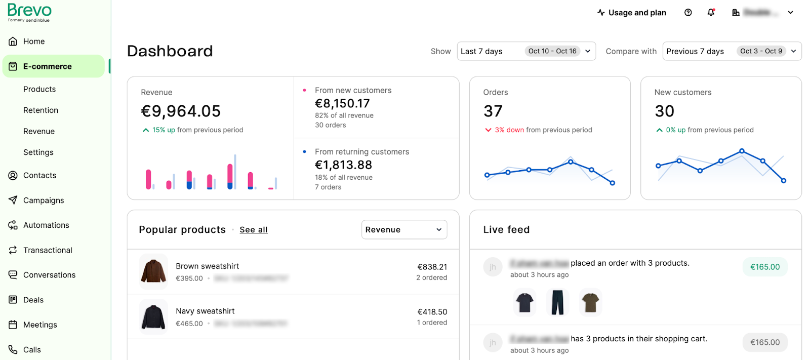 The above dashboard from Brevo shows revenue and sales. But you can easily adjust it to show other data from campaigns and leads.