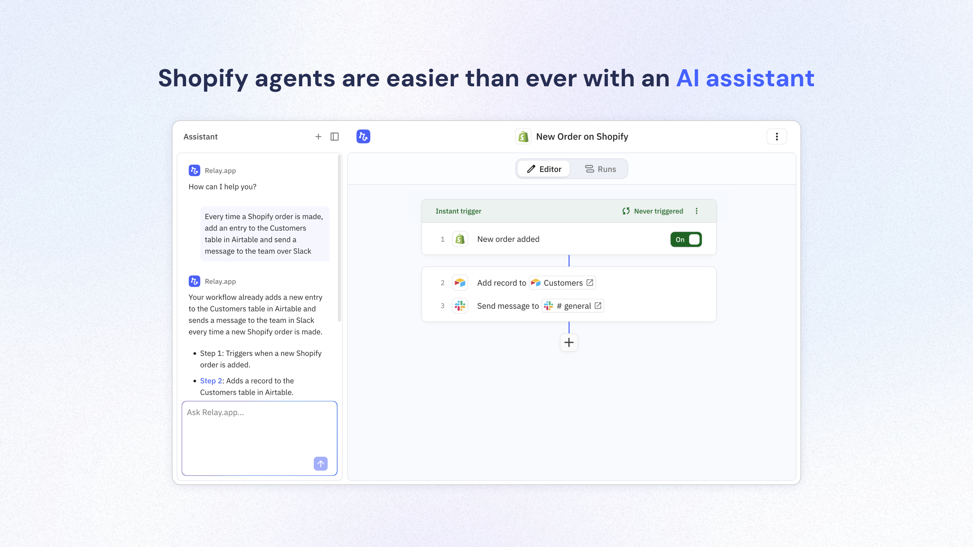 Shopify has been one of our most requested integrations, and it's finally here! ๐ If youโre a merchant, you can now use Relay.app to build AI agents to automate store management and customer workflows.