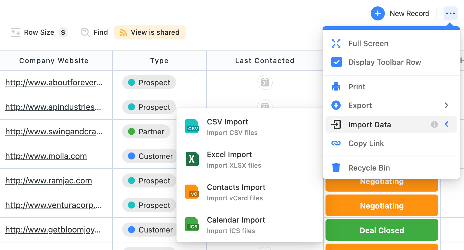 Time to add your data. The chances are you have your contacts somewhere in the digital realm—a spreadsheet, an Airtable base, or a Notion database. Whatever the case, with SmartSuite importing data is smooth and hassle-free.
