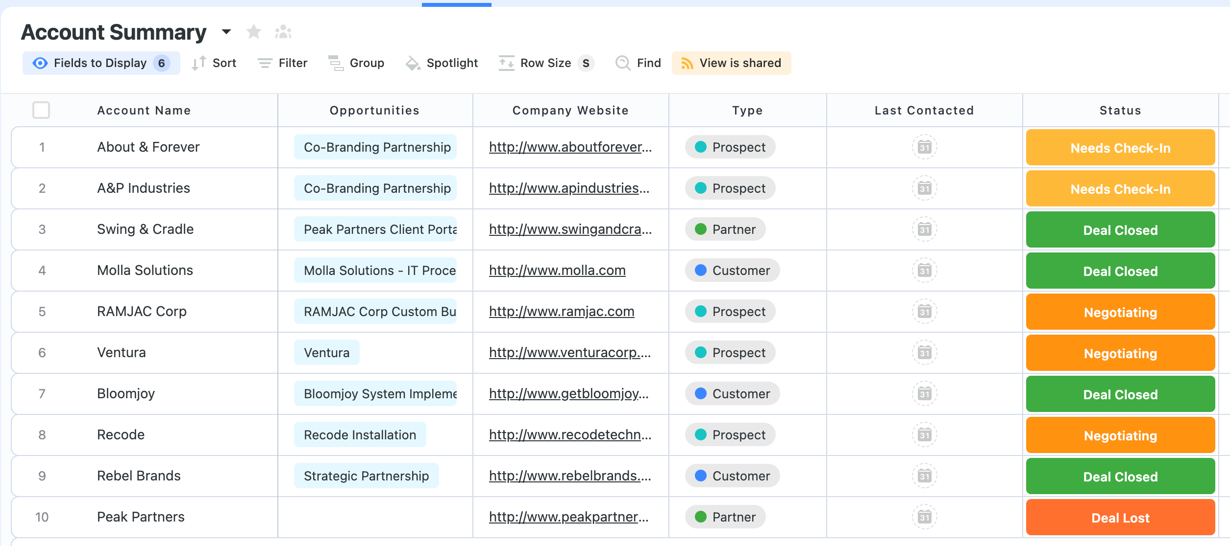 For our example, we removed the HQ location, added a status field for a more granular look at the stage of the relationship, and also added a date field to track when the customer was last contacted.