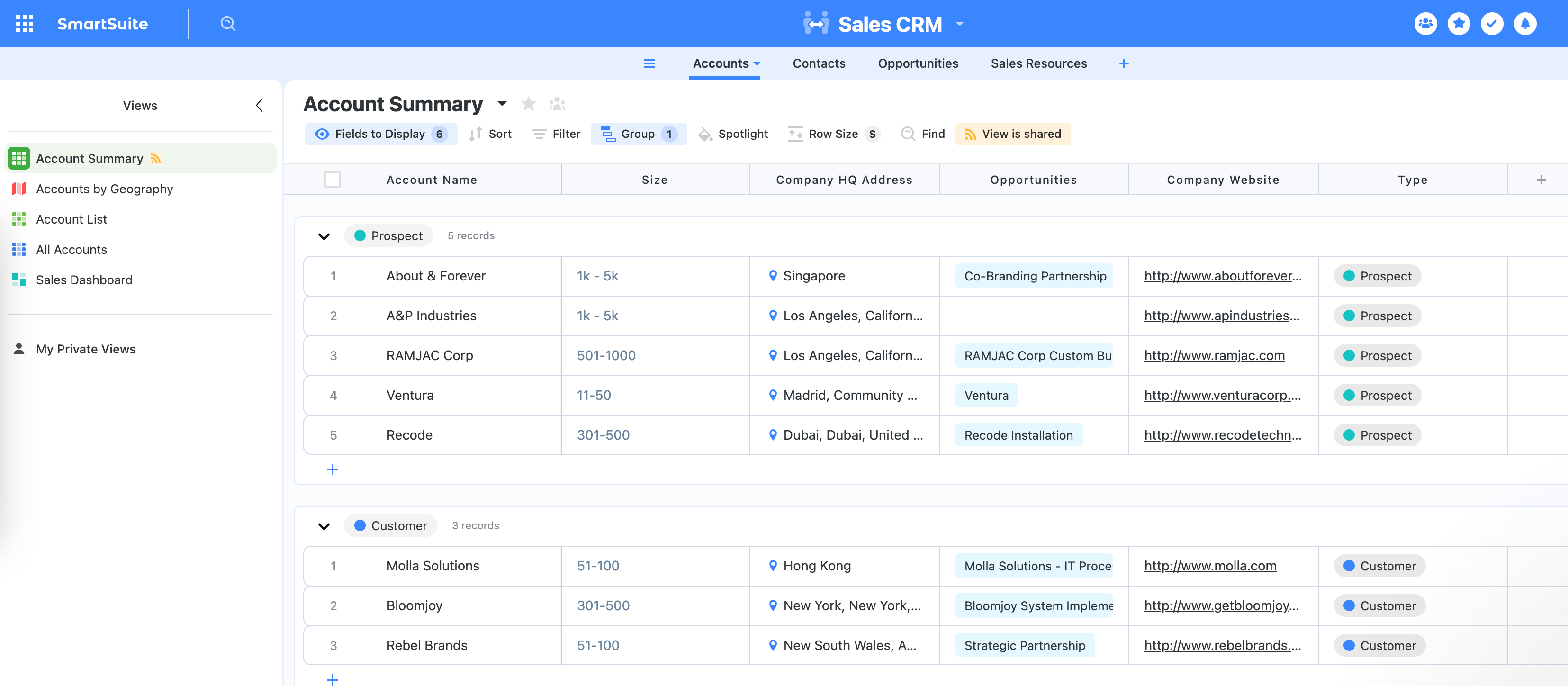 Don’t forget that SmartSuite can build connective databases similar to Airtable to better link data. For example, our Sales CRM is made up of the main accounts Database (above) with distinct databases for contacts, opportunities, and sales resources, all connected and interlinked.