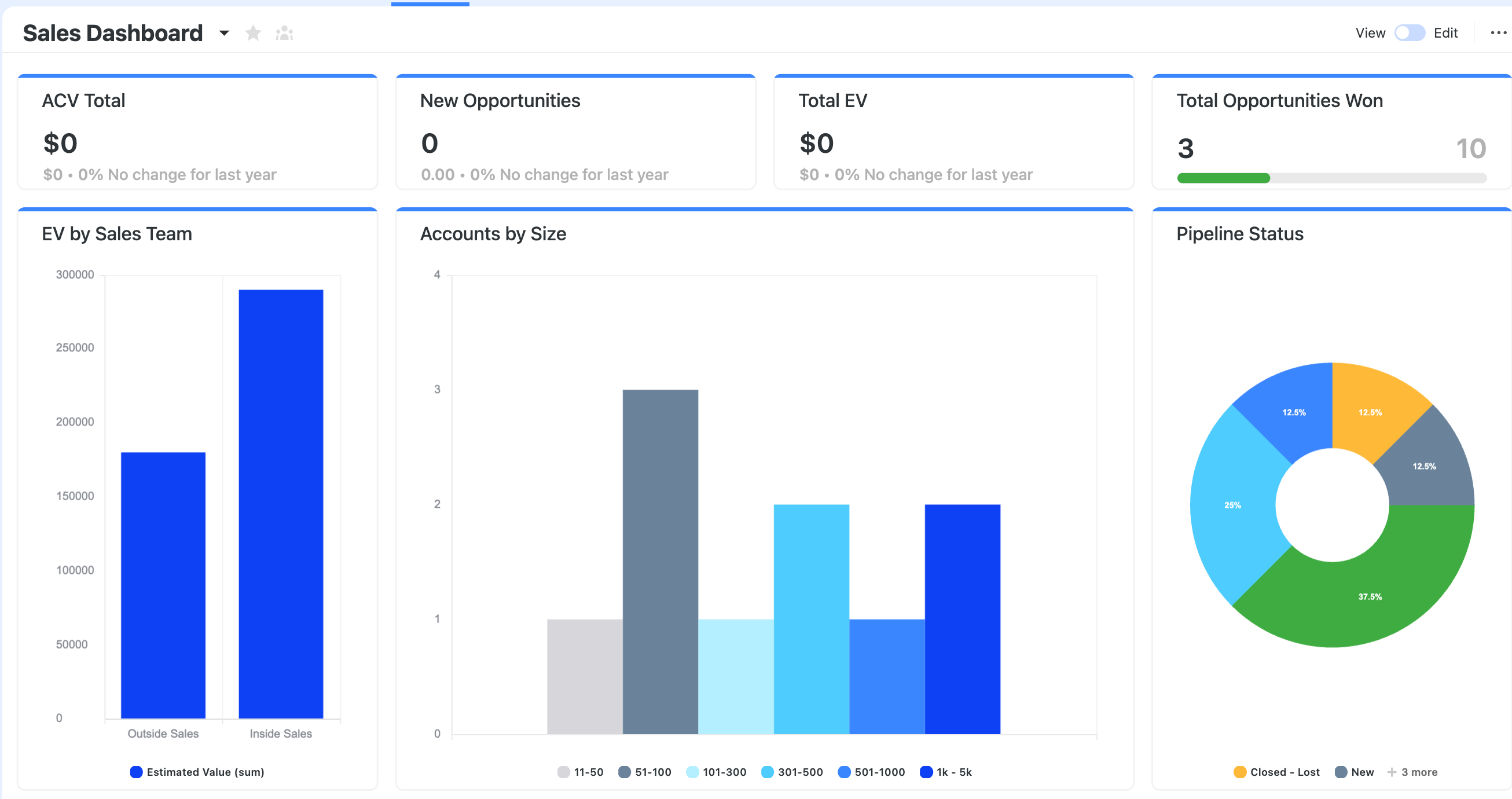 - Dashboard view provides a deep dive into your customer relationships and sales pipeline