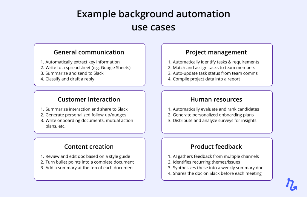 For most businesses, harnessing AI for background automations is the easiest and most impactful way to benefit from AI. These powerful systems work silently, automating everything from routine data handling to complex customer interactions, freeing up you and your team to concentrate on the bigger picture, like strategic decision-making and creative tasks. This "set it and forget it" approach means once you configure your automations, they run independently, providing benefits without any additional effort.