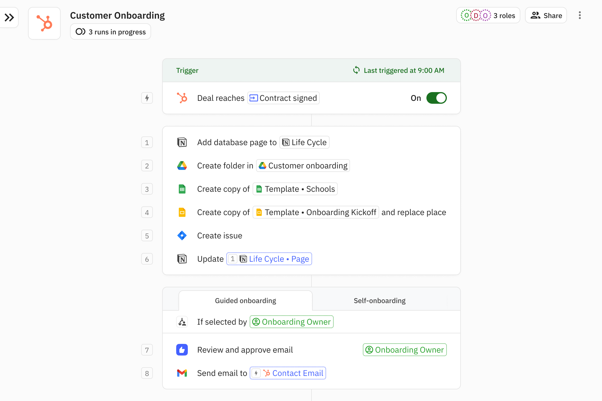 It started with one person at Cometa using Relay.app for one workflow and things grew from there. For customer onboarding, the CS team automated dozens of actions across Google Workspace, Slack, Jira, and Notion, drastically reducing the amount of manual repetitive work required for every customer.