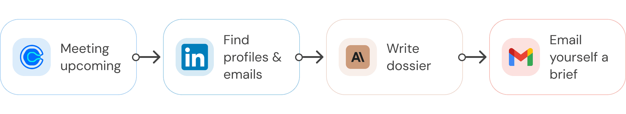 Example: When a meeting is coming up, find LinkedIn profiles and past emails with guests, write a dossier, and send it to yourself over email.