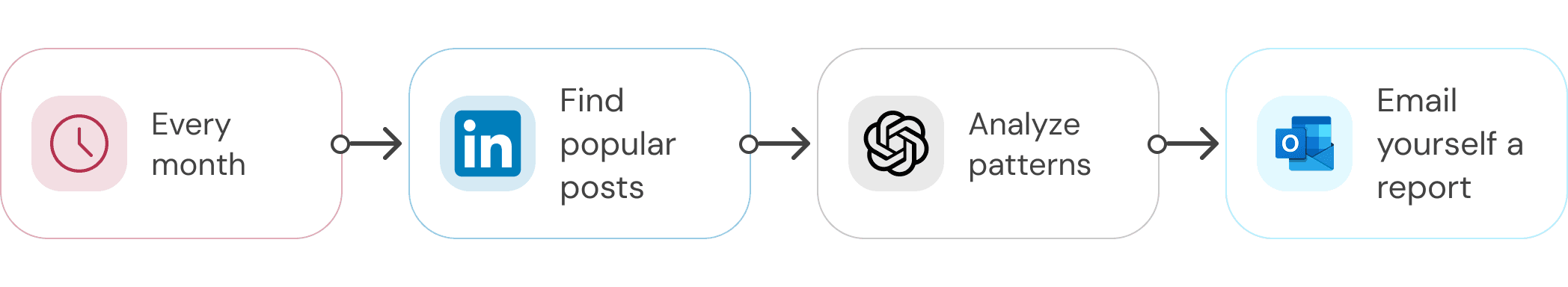 Example: Every month, look up popular LinkedIn posts form influencers in my space, analyze patterns, and email the analysis to yourself.