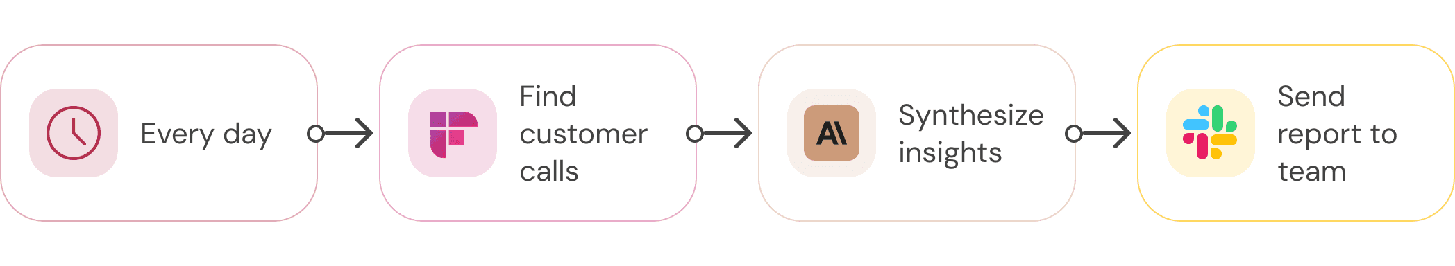 Example: Every day, look up all my team's customer call transcripts, synthesize insights, and send learnings to the team over Slack.