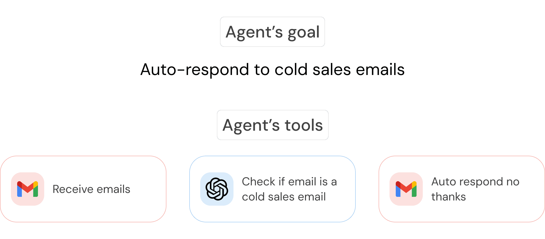 For example, the architect would give the agent a goal of automatically responding to any cold emails, as well as tools to receive emails, decide if they’re cold sales emails or not, and auto-respond.