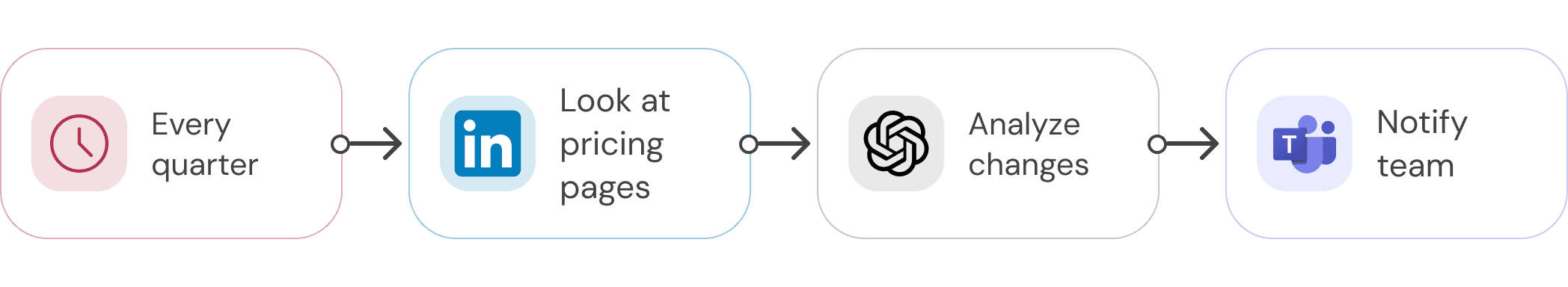Example: Every quarter, look at competitors' pricing pages, check if they have meaningfully changed or not, and notify the team if they have.