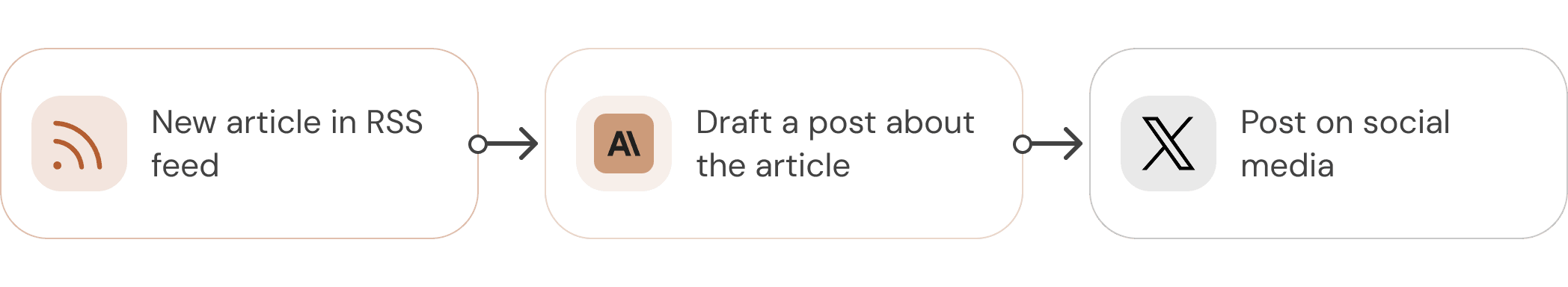 Example: When a new article is posted to an RSS feed, summarize the content and draft a social media post about it, then post it.