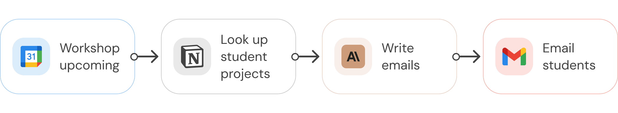 Example: When a workshop you’re running is coming up, look up all the attending students and their project statuses, write them personalized emails, and send them reminders.