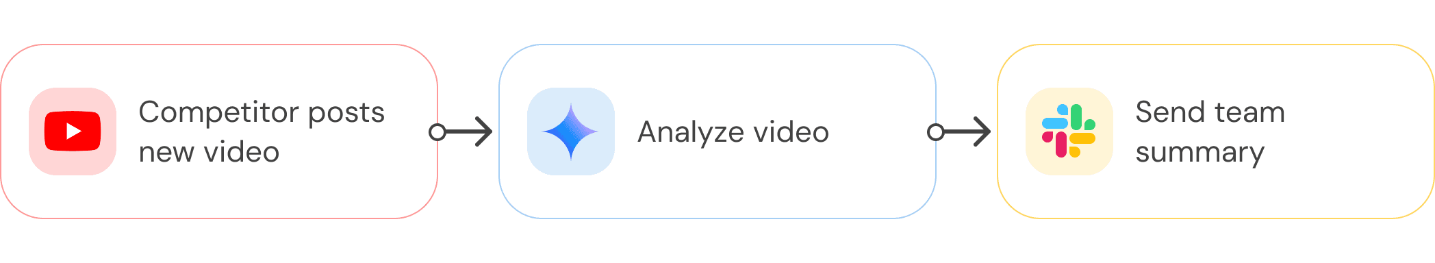 Example: When a competitor posts a new YouTube video to their channel, analyze the content and send the summary to your team on Slack.