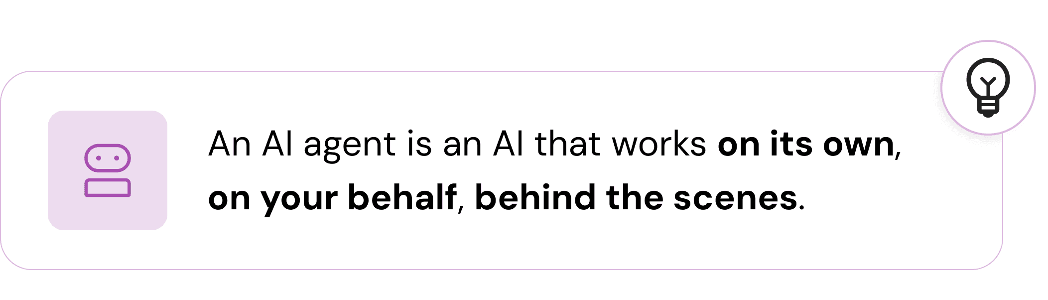 To capture the essence of the technical definition, and to differentiate agents from other common AI modalities, we propose this simple definition: An AI agent is an AI that works on its own, on your behalf, behind the scenes.