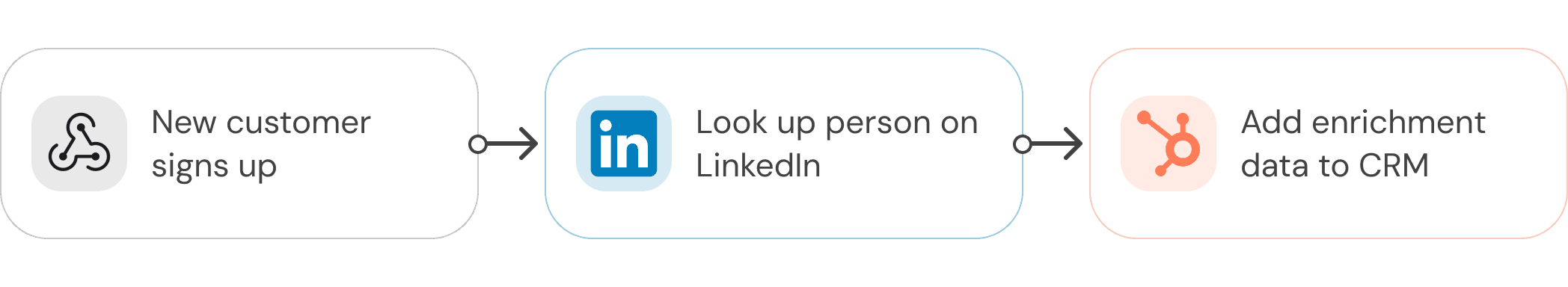 Example: When a new customer signs up for your service, look them up on LinkedIn, and add enrichment data to your CRM.