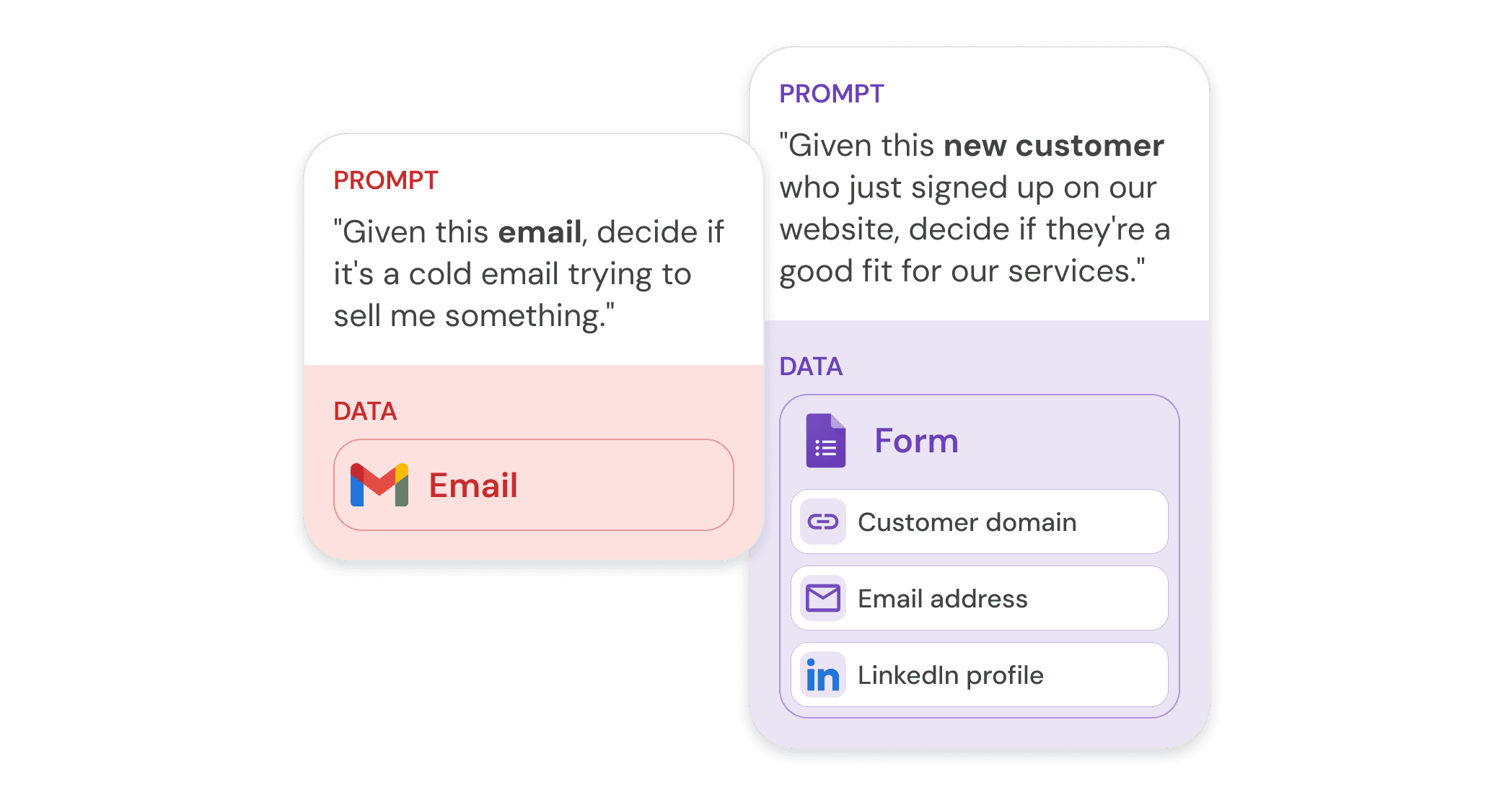 "Given this new customer who just signed up on our website, decide if they're a good fit for our services" → the data about the customer (pulled from a form, webhook, or LinkedIn lookup, for example) is the data