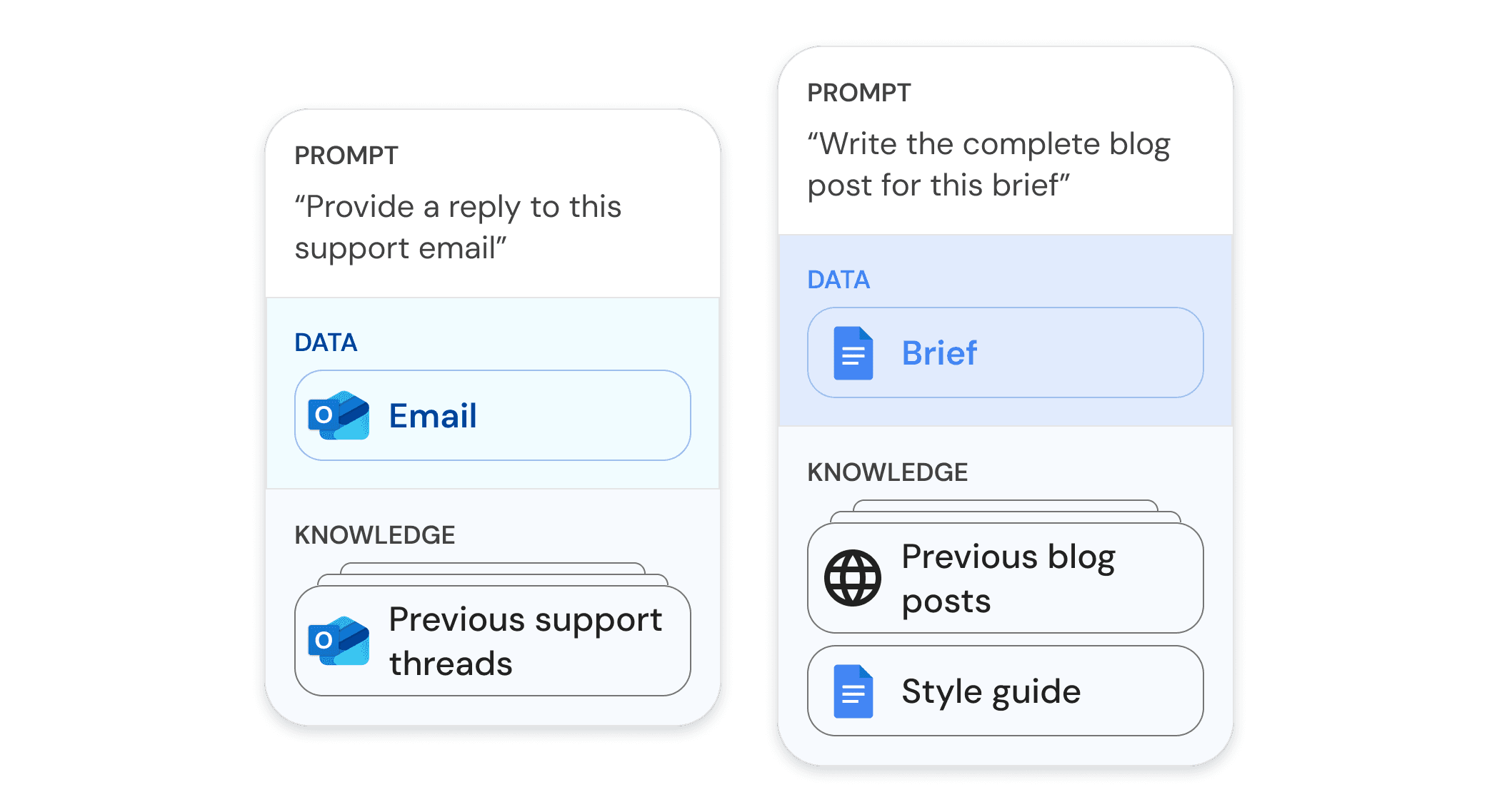 Data is the specific information that the AI can use to accomplish a specific task. Data is attached to or embedded in the prompt, and it gets sent along with the prompt to the AI when it's time to take action. If you think of your prompt as a template of instructions that's reused every time the AI agent runs, the attached data—like a specific document, profile, or meeting—is what makes the prompt unique every time.