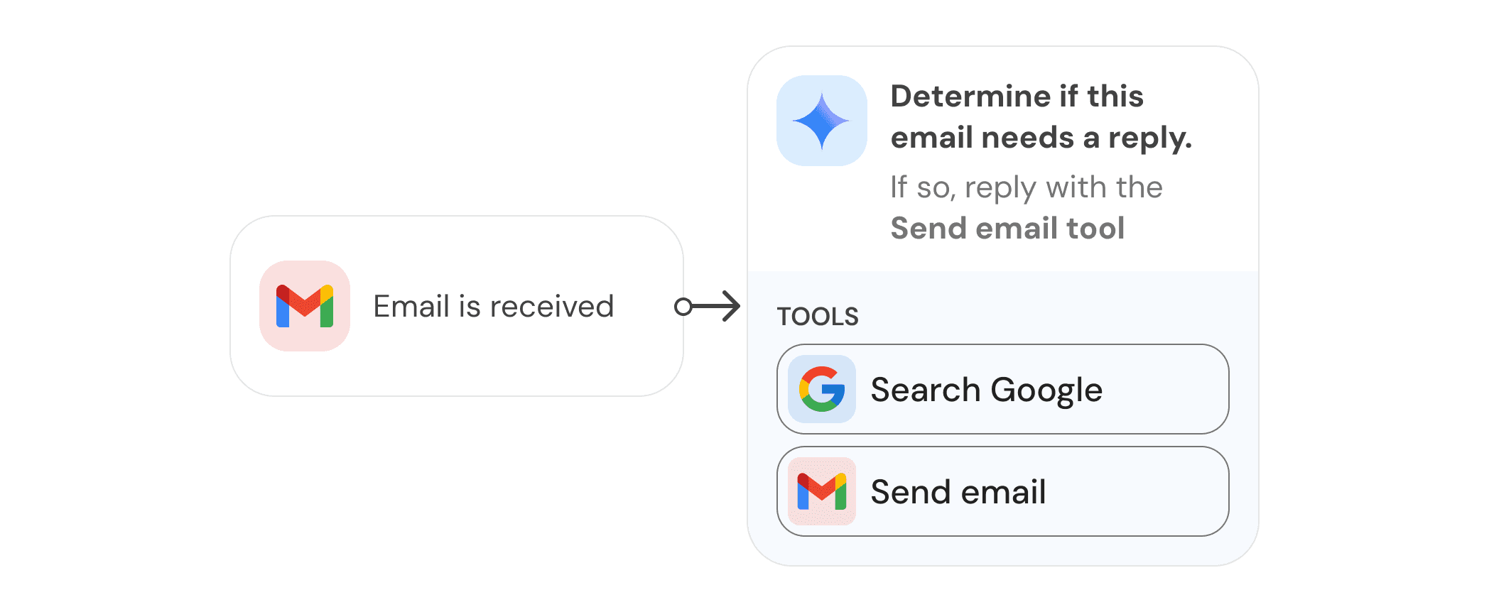 In general, you set up tools by specifying what product the AI can use (e.g. apps like Gmail, Airtable, Google, and many many others) and what action can be taken in those apps (sending emails, updating a table, running a search). You can refer to available tools in your prompt, like "Once you've determined whether the email needs a reply, use the email reply tool to send a polite response."