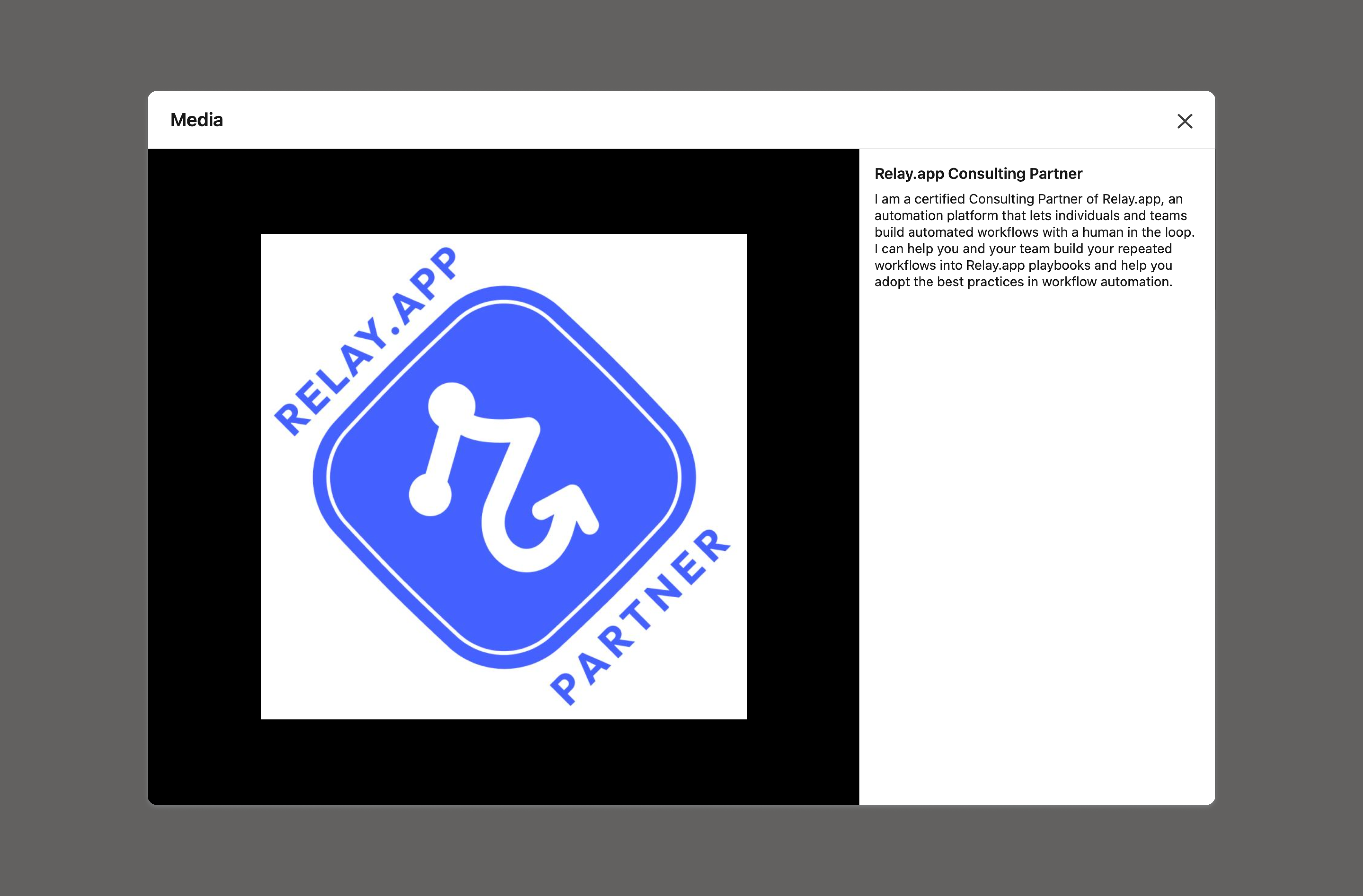 Thank you for being a Relay.app Consulting Partner! This page has the link to download your badge, a guide for adding it to your LinkedIn Profile, and other tips.