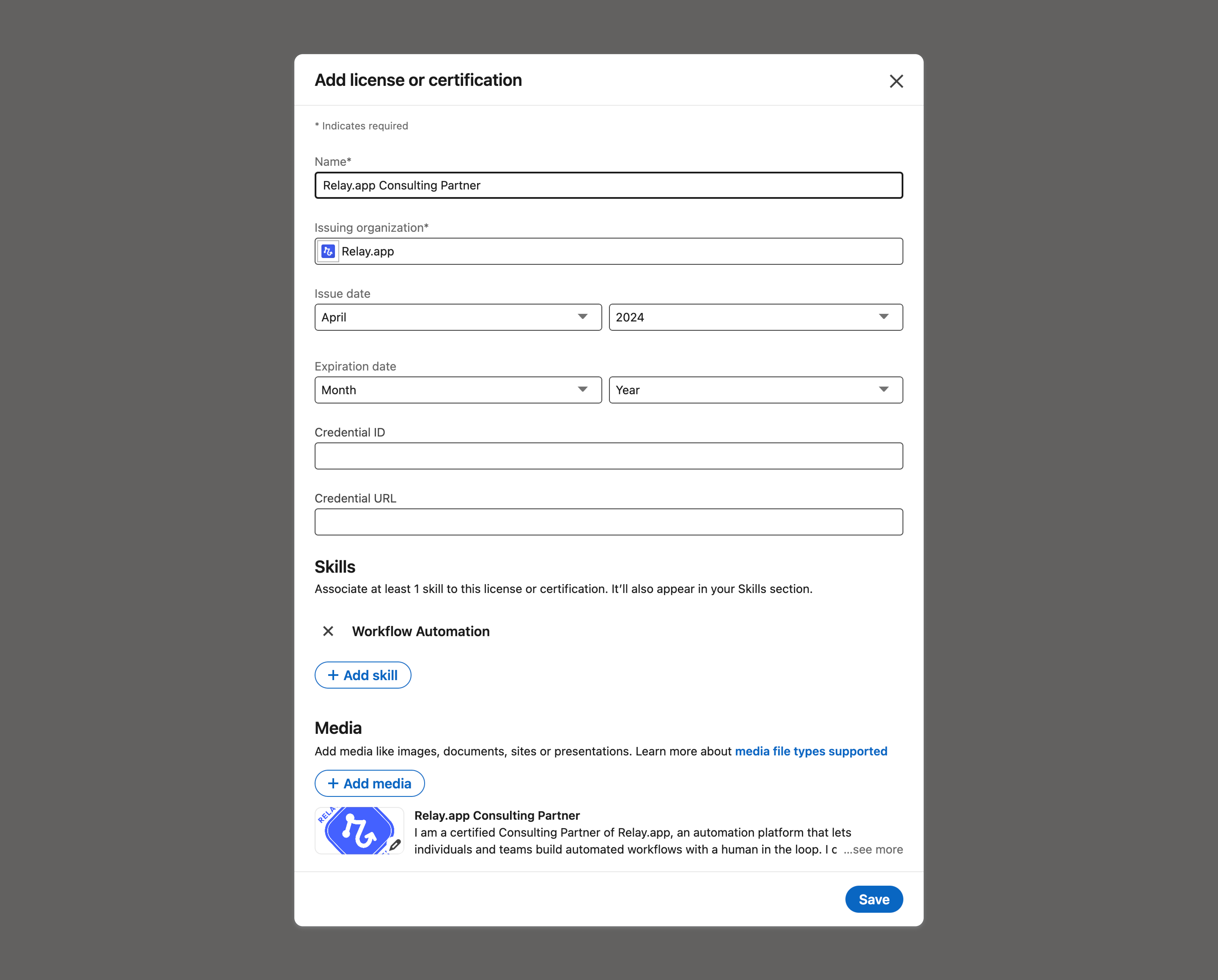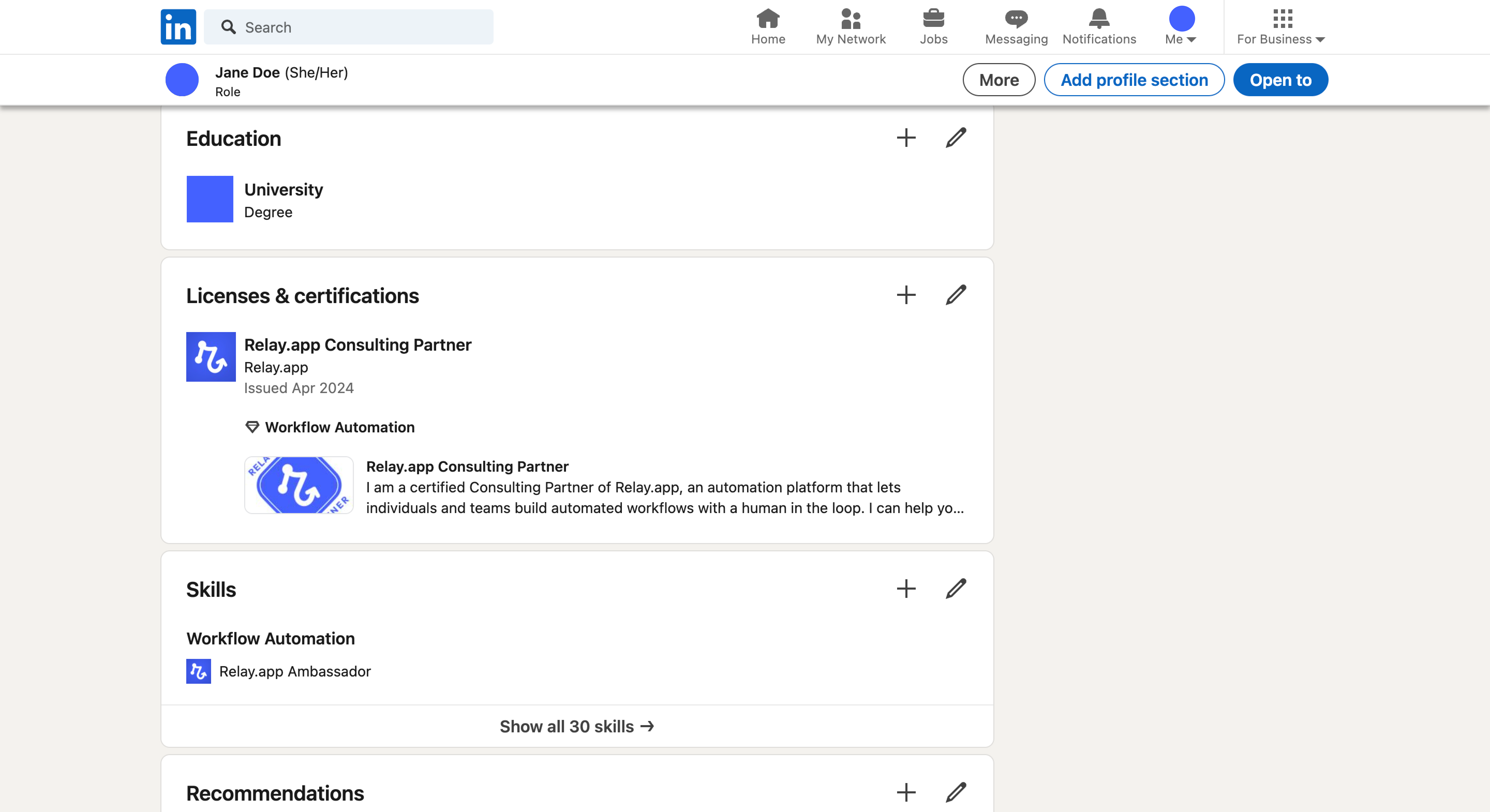 Adding a LinkedIn certification is a nice way to show the community you're a certified partner. Until we set up an official certification program to provide you with an ID and certificate, we suggest you add an unofficial Relay.app Partner Certification to your profile.